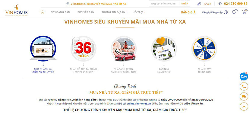 Nhân dịp ra mắt, Sàn thương mại điện tử bất động sản Vinhomes Online áp dụng chương trình ưu đãi đặc biệt – “Mua nhà từ xa, giảm giá trực tiếp” cho 600 giao dịch đầu tiên thành công tại các dự án Vinhomes Ocean Park, Vinhomes Smart City và Vinhomes Symphony. Mức giảm từ 10 - 70 triệu/căn, trong đó, 100 căn đầu tiên được giảm giá đến 70 triệu đồng.