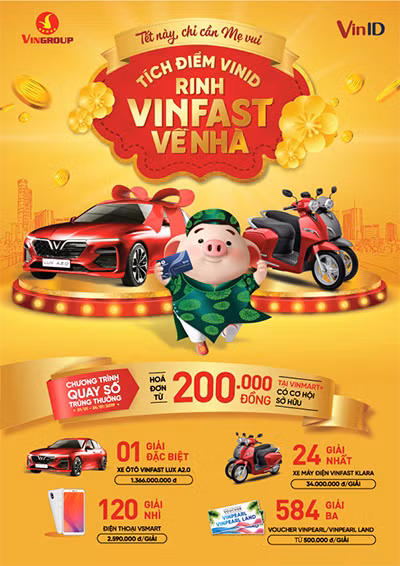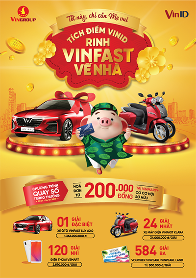 Cụ thể, từ 1/1 - 24/1/2019, thành viên VinID khi mua sắm từ 200.000 đồng tại cửa hàng VinMart+ hoặc có hóa đơn mua hàng, dịch vụ từ 500.000 đồng tại VinMart, VinPro và các điểm tiêu dùng khác trên toàn hệ thống thuộc Tập đoàn Vingroup sẽ ngay lập tức được tự động tham gia quay số trúng thưởng. Khách hàng sử dụng thẻ, ứng dụng mobile VinID may mắn nhất sẽ có cơ hội trúng thưởng 01 ô tô VinFast Lux A2.0 sang trọng trị giá gần 1.4 tỷ đồng, 24 xe máy điện Klara “Bền – Đẹp – Sinh thái” trị giá 34 triệu đồng/ chiếc, 120 điện thoại thông minh Vsmart cùng hàng trăm voucher nghỉ dưỡng 5 sao đẳng cấp tại Vinpearl.