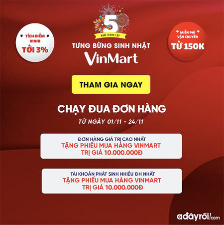 Chúc mừng VinMart thêm tuổi mới, từ nay đến 24/11, Adayroi liên tục giảm giá lên tới 50% các sản phẩm VinMart kèm cơn mưa quà tặng gồm vali mạ vàng và voucher mua sắm với tổng trị giá giải thưởng lên tới 40 triệu đồng. Đặc biệt, duy nhất trong ngày 20/11, khách hàng còn có thể săn nhiều sản phẩm giá trị với giá chỉ 5.000VNĐ trên Adayroi. Khách hàng có thể tham gia ngay tại đây.