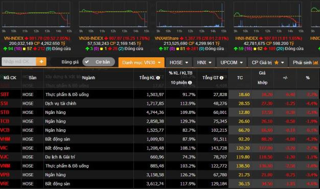 Đóng cửa phiên giao dịch, chỉ số VN-Index giảm 20,52 điểm (2,05%), lần nữa xuyên thủng mốc 1.000 điểm xuống chỉ còn 981,78 điểm; HNX-Index giảm 1,65% xuống 107,81 điểm và UPCoM-Index giảm 0,23% xuống 56,88 điểm. Số mã giảm điểm trên 3 sàn áp đảo với 405 mã, trong khi chỉ có 233 mã tăng điểm trong phiên hôm nay.