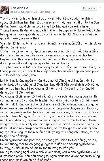 Trước khi bức ảnh này chính thức được “bầu sô” trên chia sẻ công khai, vào ngày 26-11, Lê Vân Anh - vợ của doanh nhân Chu Đăng Khoa đã đăng những chia sẻ trên trang Facebook cá nhân, trong đó người phụ nữ này cho rằng “trong chuyện tình cảm làm gì có chuyện bảo là thua hay thắng cuộc, tôi chỉ thua bản thân tôi”.