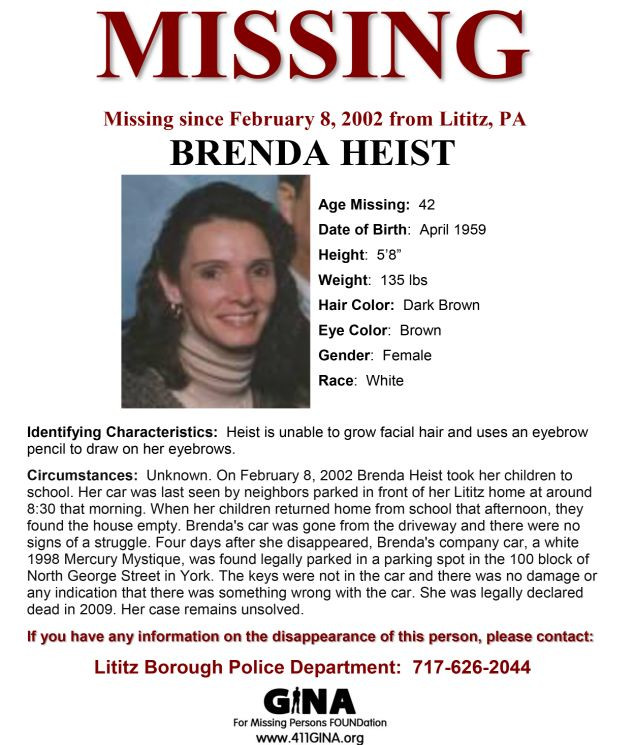 Vào ngày 8-2-2002, ông Lee Heist sống tại thành phố Pennsylvania (Mỹ) báo với cảnh sát rằng vợ ông- bà Brenda Heist đã mất tích. Lần cuối cùng có người nhìn thấy cô Brenda là khi cô đưa hai con tới trường tại thị trấn Lititz.
