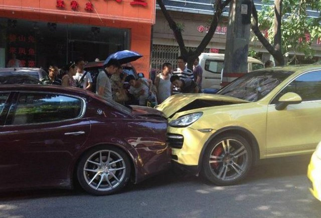Điều đáng nói là xe của người vợ là một chiếc Porsche Cayenne Turbo, và chiếc xe còn lại cũng đắt đỏ không kém – một chiếc sedan Maserati Quattroporte. Ước tính chi phí sửa chữa cho cả hai chiếc xe sang trọng này lên tới 50.000 USD, và dĩ nhiên công ty bảo hiểm sẽ không chịu trách nhiệm cho sự việc này.