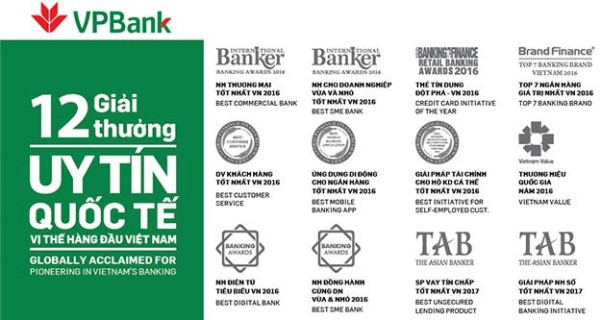 Trong năm nay, Asian Banker – tạp chí uy tín hàng đầu về tài chính và ngân hàng tại khu vực châu Á – cũng đã giành cho VPBank ba giải thưởng, bao gồm: “Giải pháp Ngân hàng số tốt nhất Việt Nam”, “Ngân hàng cung cấp sản phẩm vay tín chấp ưu việt nhất Việt nam” và “Sản phẩm vay tín chấp tốt nhất khu vực châu Á”.