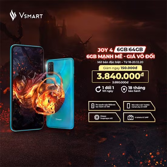 Vsmart Joy 4 ra mắt lần đầu vào tháng 9/2020 với 2 phiên bản 3GB và 4GB RAM. Từ khi ra mắt, Vsmart Joy 4 vẫn là một trong những lựa chọn hàng đầu ở phân khúc 3- 4 triệu đồng. Dòng smartphone này của hãng điện thoại Việt được trang bị kèm chip 8 nhân Qualcomm Snapdragon 665, màn hình lớn 6.5’’ Full HD+, viên pin lớn 5.000 mAh và sạc nhanh 18W.
