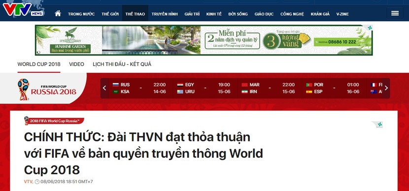 Thông báo trên trang chủ của VTV có đoạn: "Sau thời gian đàm phán, vào lúc 18h30 chiều ngày 8-6-2018, Đài Truyền hình Việt Nam và Liên đoàn bóng đá thế giới FIFA đã đạt được thỏa thuận về việc Đài Truyền hình Việt Nam nắm giữ bản quyền truyền thông Giải vô địch bóng đá thế giới World Cup 2018 tại Việt Nam.