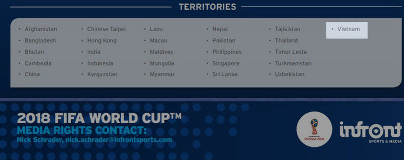 Ngày 1-6, thời điểm World Cup 2018 chỉ còn 13 ngày nữa sẽ chính thức khởi tranh tại Nga, phía Infront Sports & Media đã bổ sung tên Việt Nam vào danh sách 26 quốc gia/đối tác mà đơn vị này bán bản quyền truyền hình World Cup 2018 thành công.
