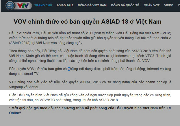Bên cạnh việc thông tin việc VOV chính thức có bản quyền ASIAD 18 ở Việt Nam, VTV cũng cho biết: "Hiện VTV đã gửi công văn đề nghị được tiếp phát nguyên trạng các chương trình, các trận thi đấu, do VOV/VTC phát sóng, trong khuôn khổ ASIAD 2018".