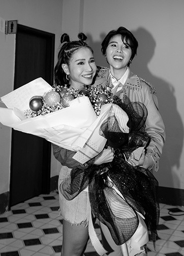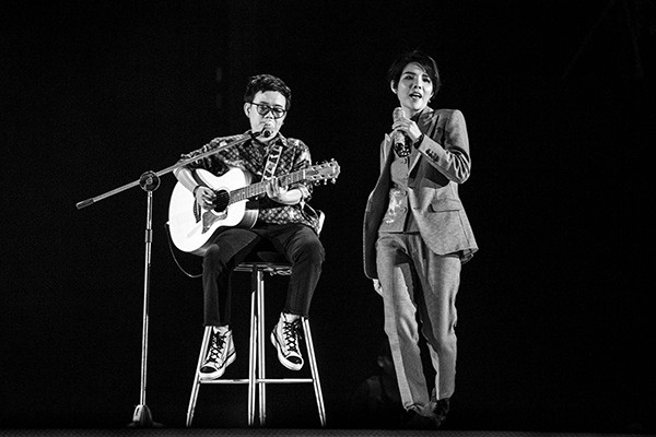 Trên sân khấu, nhạc sĩ Phương Uyên đệm đàn và song ca với Vũ Cát Tường. Sự hòa quyện giữa chất giọng đầy nội lực của 2 nghệ sĩ khiến không khí ở nhà thi đấu ngập tràn cảm xúc còn khán giả thả mình phiêu theo từng nốt cao của "Dõi theo".