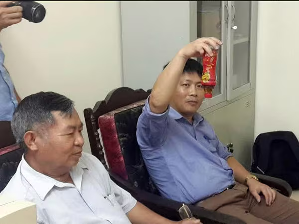 Ông Hoàng Văn Tuế (áo trắng), Phó Chủ tịch Hội Tiêu chuẩn và Bảo vệ người tiêu dùng Thanh Hóa và ông Xuân Hùng - người tiêu dùng khiếu nại về sản phẩm tại buổi làm việc với đại diện Tập đoàn Tân Hiệp Phát