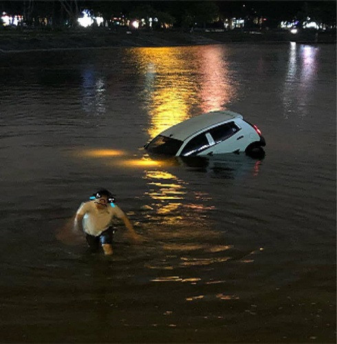 Chiếc xe ô tô 5 chỗ hiệu Kia Morning lao xuống hồ Linh Đàm do lái xe đạp nhầm chân ga vào tối 1-5-2019
