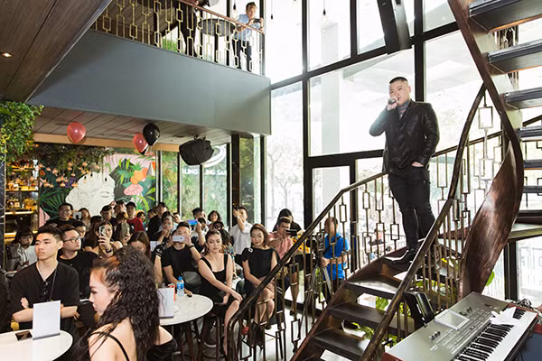 Vũ Duy Khánh gây ấn tượng khi hát live tại buổi họp báo trước đông đảo phóng viên và khách mời