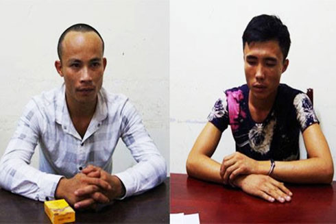Hai nghi can Hà (áo trắng) và Xin tại cơ quan công an