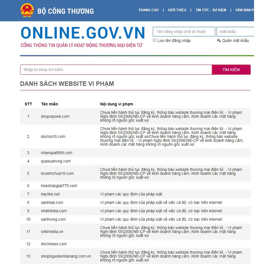 Những tên miền website bị cho là vi phạm được đăng tải công khai trên website của Cục TMĐT & KTS