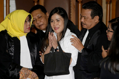 Wongso (giữa) bên cạnh các luật sư bào chữa sau khi bị tuyên án