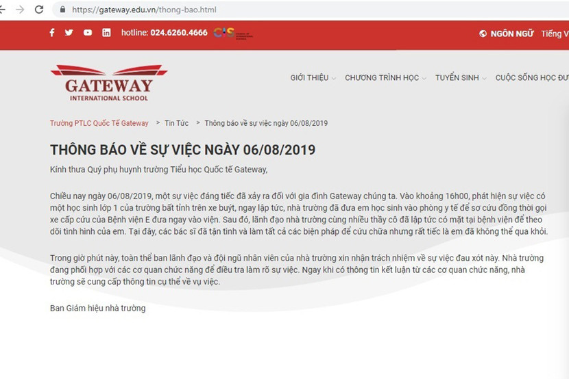 Lời nhận trách nhiệm của trường Gateway sau sự việc đau lòng
