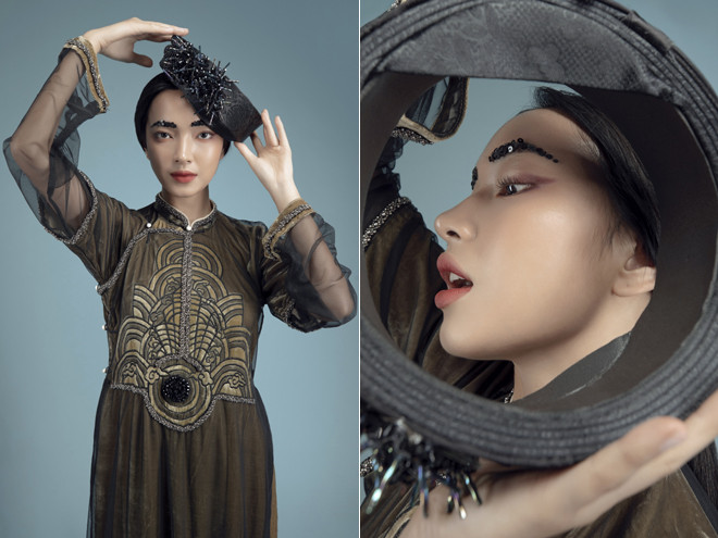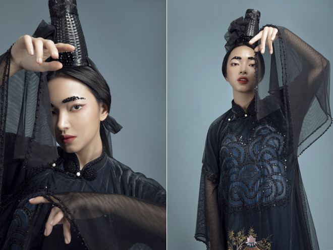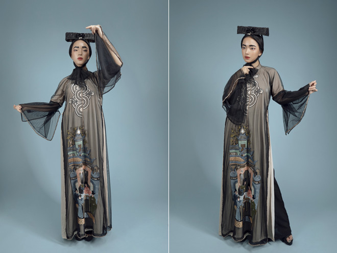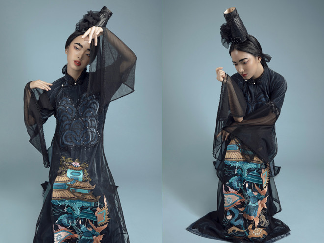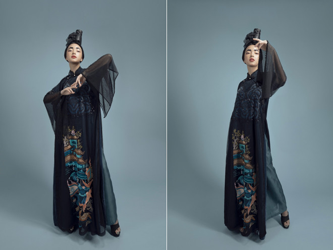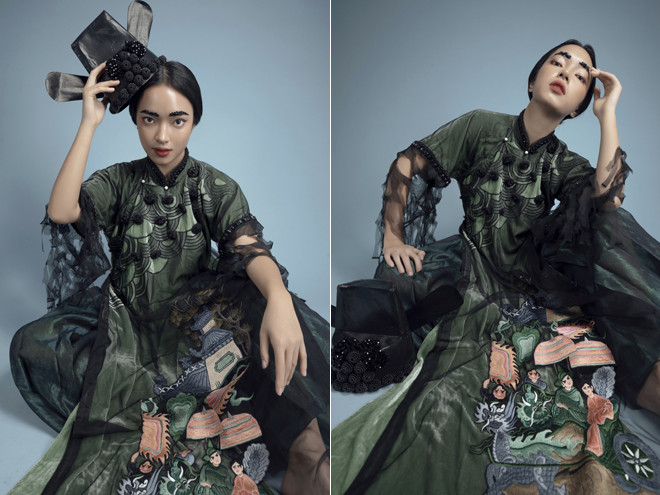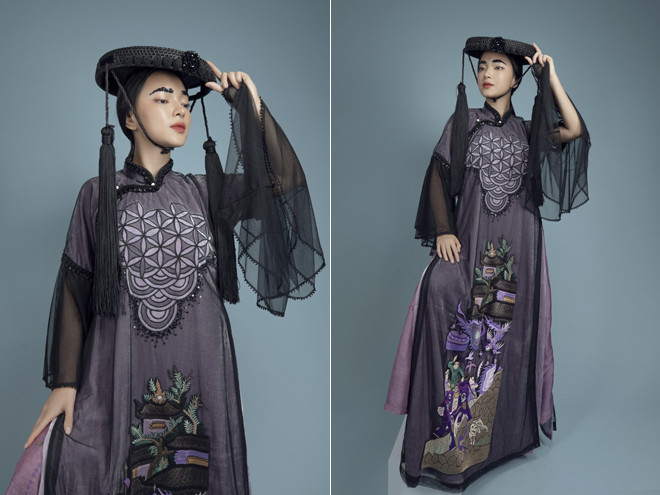 Cách xử lý chất liệu tinh tế và tỉ mỉ đã tạo hiệu ứng trên bề mặt áo. Những họa tiết thuỷ ba sóng nước và tam sơn được cách điệu đưa vào phù hợp với từng phân cảnh thêu trên tà áo. Màu sắc và chất liệu theo xu hướng của thời trang thế giới mà vẫn thể hiện rõ được nét văn hóa truyền thống vốn luôn được nhà thiết kế của Hà thành đặt làm tiêu chí nền móng cho những tác phẩm của mình.