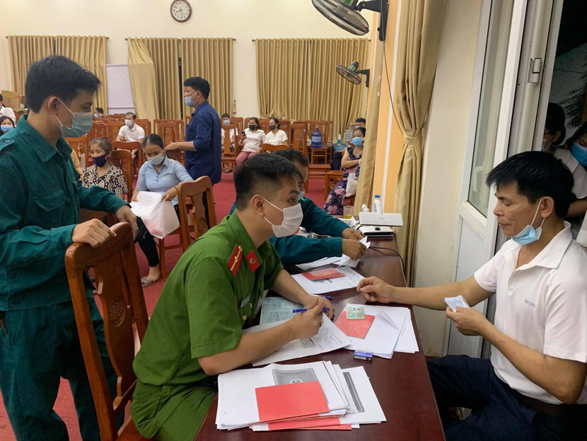 Ghi nhận PV, tối 8-5, tại điểm cấp căn cước công dân gắn chíp ở hội trường trụ sở UBND xã Kim Quan, huyện Thạch Thất, Hà Nội có rất đông người dân đến làm căn cước. Ngay tại khu vực sảnh hội trường, các CBCS Công an xã Kim Quan và lực lượng chức năng đã bố trí các bàn ghi hồ sơ.