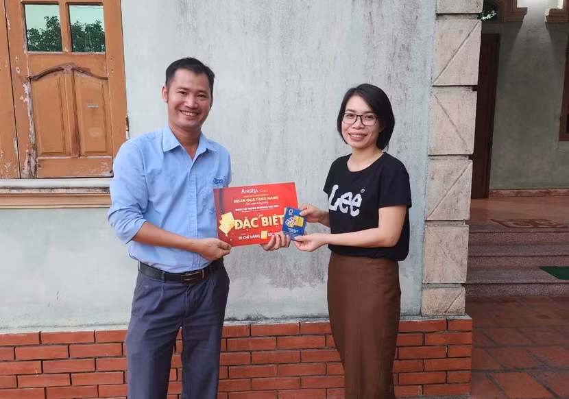 Chị Phan Thị Kim Lan được đại diện nhãn hàng Angela Gold trao tận tay giải thưởng 01 chỉ vàng SJC. Ảnh: Ecogreen