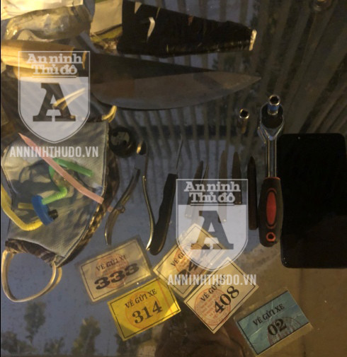 Trong quá trình kiểm tra, các trinh sát đã phát hiện đối tượng trên giấu trong cốp xe một bộ dụng cụ để bẻ khóa xe máy, gồm 1 tay công dài 15 cm, 5 tay vam dài 7 cm, 1 kìm mini, 1 dụng cụ chọc khe khóa. Ngoài ra, thanh niên này còn giấu một con dao bầu được bọc sơ sài trong tờ giấy, cùng rất nhiều vé gửi xe khác nhau.