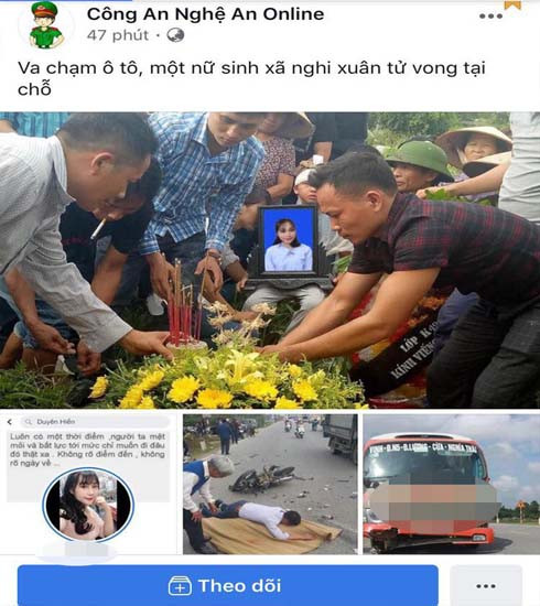 Chiều 28-6, nữ sinh Trần Thị Mỹ Duyên (21 tuổi, trú tại huyện Nghi Lộc, tỉnh Nghệ An) hoảng hồn sau khi ngủ dậy, nhận được hoàng loạt tin nhắn hỏi thăm, chia buồn vì sự ra đi đột ngột của mình. Lý do có sự việc trên là trên trang mạng xã hội lấy tên giả mạo “Công an Nghệ An Online” có đăng tải hình ảnh va chạm giao thông cùng với đám tang và trang mạng cá nhân của Duyên.