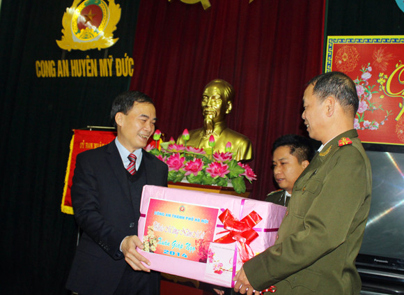 Tại buổi làm việc với CBCS - CAH Mỹ Đức, Thiếu tướng Phạm Xuân Bình, Phó Giám đốc CATP Hà Nội đã thay mặt Ban Giám đốc CATP Hà Nội gửi lời chúc mừng tốt đẹp nhất, đồng thời tặng quà Tết của Ban Giám đốc đến tập thể chỉ huy CBCS CAH Mỹ Đức.