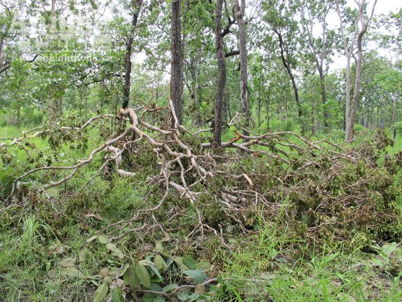 Tiếp tục đi sâu vào các tiểu khu 484 và 477, chúng tôi phát hiện thêm các điểm khai thác gỗ quý hiếm, mà theo dấu vết để lại tại hiện trường cho thấy, phần lớn gỗ quý được khai thác trong khoảng thời gian cuối tháng 7 vừa qua. Như vậy, mới lội rừng ở hai tiểu khu 477 và 484, chúng tôi đã phát hiện có ít nhất hơn 50 cây gỗ căm-xe cổ thụ (thuộc nhóm 2) vừa bị lâm tặc khai thác trái phép với khối lượng gỗ vận chuyển chót lọt ra khỏi rừng lên đến hơn 50m3.