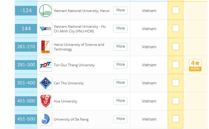 Ngoài ra, Việt Nam có 6 trường đại học lọt vào bảng xếp hạng này gồm ĐHQG TP.Hồ Chí Minh, ĐH Bách khoa Hà Nội, ĐH Tôn Đức Thắng, ĐH Cần Thơ, ĐH Đà Nẵng, ĐH Huế.