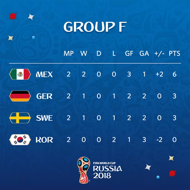 Lúc này, tại bảng F, Đức đang tạm xếp thứ 2 và có lợi thế cực lớn cho việc giành vé vào vòng 1/8, khi chỉ phải gặp Hàn Quốc ở lượt trận cuối cùng. Trong khi đó, Thụy Điển sẽ phải quyết đấu với Mexico để nuôi hy vọng. Mexico có 6 điểm nhưng lúc này vẫn chưa chắc suất đi tiếp.