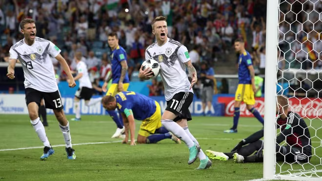 Die Mannschaft tiếp tục bế tắc với hàng tấn công chậm chạp và thiếu đột biến. Trong hoàn cảnh ấy, Joachim Low buộc phải tăng cường hàng công với sự có mặt của Mario Gomez. Và người Đức tìm được bàn gỡ hòa ngay đầu hiệp 2, khi Timo Werner có pha đưa bóng vào từ cánh trái cho Marco Reus chạy cắt mặt đệm lòng đơn giản, quân bình tỉ số. Đây cũng là bàn thắng đầu tiên của Reus ở đấu trường World Cup dù anh đã 29 tuổi.