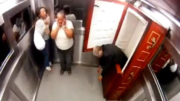 Tất cả những người đi thang máy đều kinh hoàng tột độ khi bỗng dưng nắp quan tài bật mở và xác chết bất thình lình chui ra. Có người la hét với hi vọng ai đó nghe thấy để cứu họ, có người bấm nút thang máy liên tục với mong muốn trốn ra được chiếc thang máy ma quỷ này càng nhanh càng tốt. Trong lúc đó thì có một người đàn ông do quá sợ hãi mà trốn sau lưng bạn gái khiến cô trở thành tấm “lá chắn” cho mình. Thậm chí có người phụ nữ can đảm trấn tĩnh mọi người và dũng cảm chiến đấu với thây ma khi nó bước ra khỏi quan tài và tiến về phía cô.