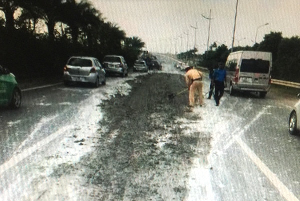 Sáng 23-10, tổ công tác đội CSGT số 15, Phòng CSGT, CATP Hà Nội do Thượng úy Nguyễn Duy Khánh chỉ huy, làm nhiệm vụ trên đường Võ Nguyên Giáp, phát hiện tại km 6+400 có hàng chục mét đường bị đất đá, phế thải rơi vãi gây mất ATGT.