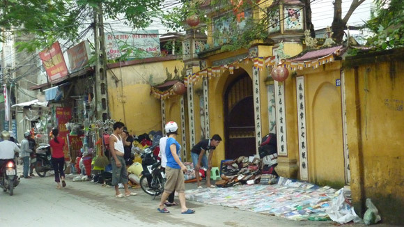 Vào đầu giờ chiều, khu vực trước cổng chùa bị một người thiếu ý thức chiếm dụng làm nơi buôn bán quần áo, sách vở (ảnh).
