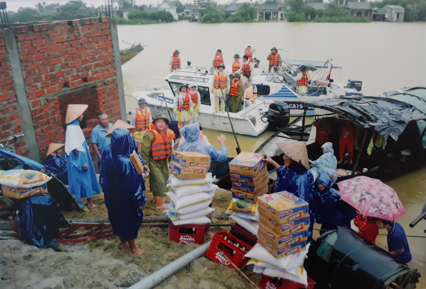 Các chiến sỹ Công an trao tận tay bà con vùng ngập lụt những thùng mì tôm, bao gạo