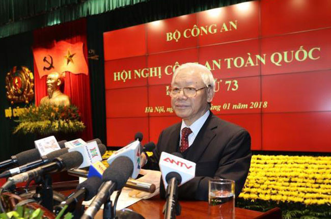 Tổng Bí thư Nguyễn Phú Trọng phát biểu chỉ đạo tại Hội nghị Công an toàn quốc lần thứ 73 (Ảnh: TTXVN)
