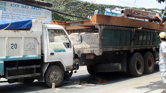Khi người đàn ông vừa lách tay lái né tránh xe cẩu thì bị chiếc xe ben BKS 57H – 7320 chạy phía sau lao tới tông thẳng vào.