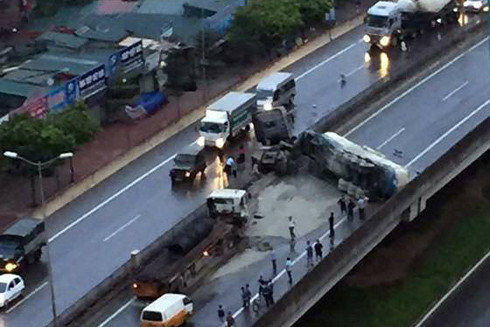 Trung tá Nguyễn Trung Thành, Đội trưởng Đội CSGT số 6 Phòng CSGT đường bộ, đường sắt CATP Hà Nội cho biết: “Chiếc xe bồn đang lưu thông theo hướng từ Trung tâm thương mại Big C đi cầu Thăng Long, khi đến gần ngã tư Phạm Hùng - Dương Đình Nghệ đã thiếu chú ý quan sát và đâm vào đuôi xe tải đang đỗ trái chiều trên đường cao tốc. Hậu quả, chiếc xe bồn bị lật ngang đường, rất may không có thương vong”.