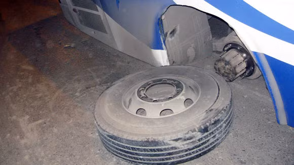 Bánh phía sau của chiếc xe khách bị văng ra ngoài