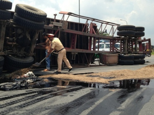 Ngay sau khi sự cố xảy ra, đội CSGT Cát Lái đã có mặt tại hiện trường lập biên bản, điều tiết giao thông. Nhìn dầu nhớt chảy tràn lan gây khó khăn cho người đi đường, các chiến sĩ CSGT đã xúc cát lấp vết dầu nhớt trên đường.