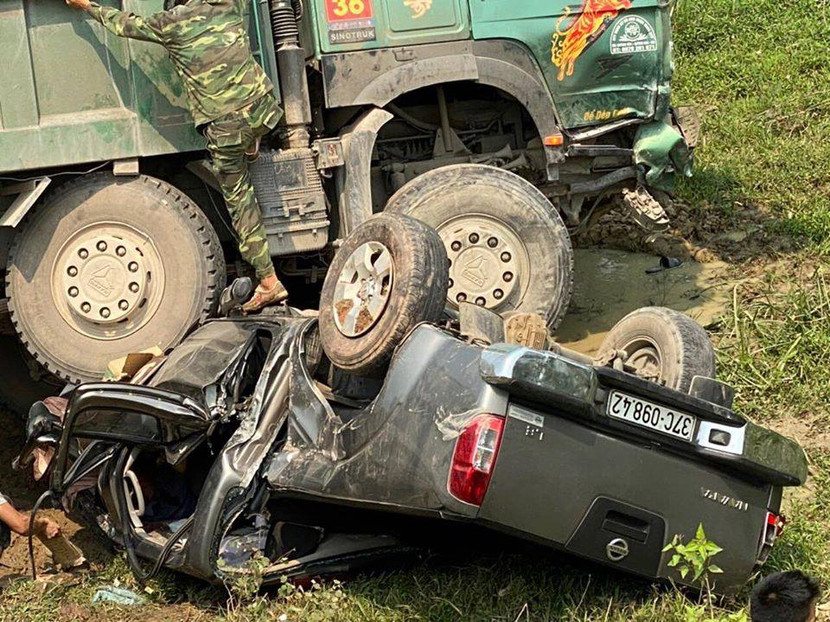 Tại hiện trường, chiếc xe hổ vồ đè lên xe bán tải. Đầu chiếc xe hổ vồ hư hỏng. Riêng chiếc xe bán tải bị bẹp dúm hoàn toàn.