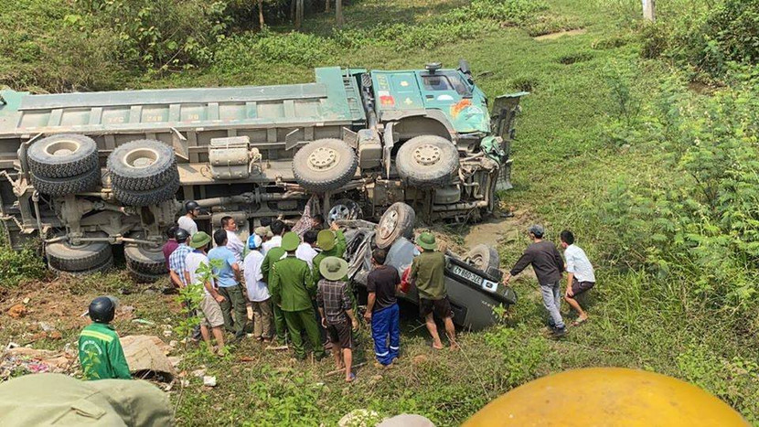 Cú đâm vực mạnh, khiến cả hai chiếc xe văng khỏi đường Hồ Chí Minh rồi lao xuống ruộng sâu 5 mét.