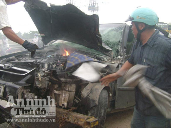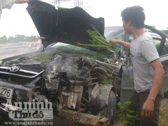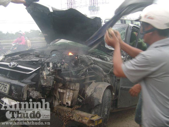 Cú đâm mạnh, khiến chiếc "xế hộp" văng ra nát bét phần đầu, 2 người trên cabin bị thương mắc kẹt lập tức được mọi người phá cửa giải cứu đem đi cấp cứu. Cùng lúc đó ngay bộ phận máy của chiếc "xế hộp" bị chập điện nên khói lửa bốc nghi ngút, nhiều người tại hiện trường đã hô hoán nhau dùng cành cây, nước để dập lửa. Sau khoảng 5 phút ngọn lửa tại chiếc xế hộp được dập tắt.