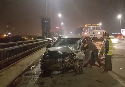 Tại hiện trường chiếc xe con bị hư hỏng nặng phần đầu, kính chắn gió bị vỡ, bên trong túi khí bật bung ra. Mặt cầu Nhật Tân vẫn còn vương vãi hàng trăm mảnh kính nhỏ.
