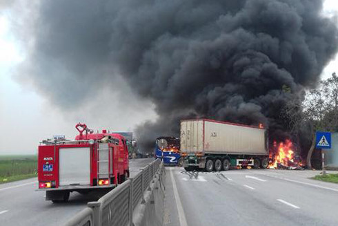 Vụ tai nạn làm xe khách cháy trơ khung, đầu container bị cháy rụi. Vụ cháy làm tắc nghẽn giao thông Quốc lộ 1A hơn 120 phút. Nguyên nhân vụ cháy đang được lực lượng chức năng tiến hành điều tra làm rõ.