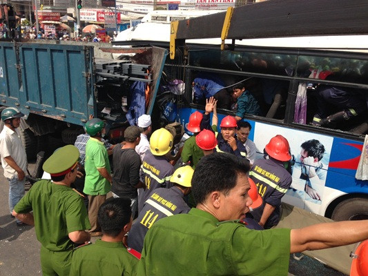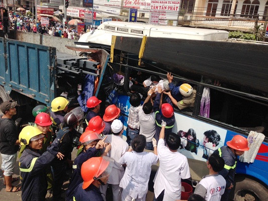 Nhiều người đi xe máy vượt lên phía trước, chiếc xe khách tông trực diện vào đuôi xe tải chở thép đang dừng. Lực tông mạnh làm chiếc xe tải có đà lao thẳng về phía trước va vào đuôi xe tải loại 15 tấn chở đất dừng phía trước trước. Vụ tai nạn giao thông bất ngờ làm nhiều người đi đường hoảng sợ.