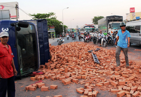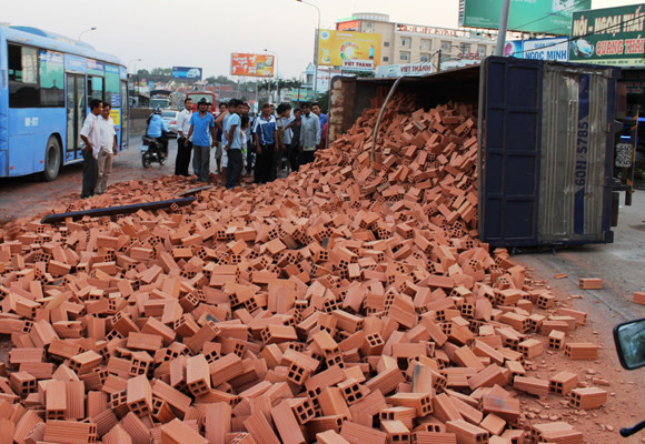 Đang lưu thông trên đường, chiếc xe chở gạch bất ngờ lật nhào