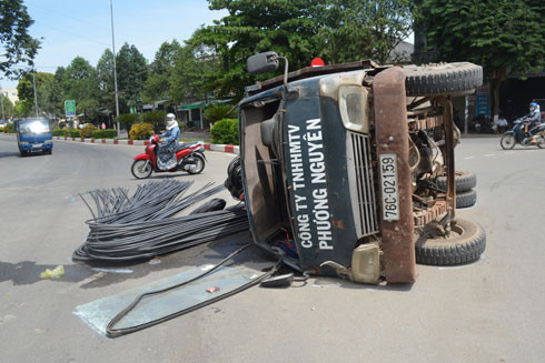Vào thời điểm trên, xe tải chở sắt mang biển số 76C 021.59 do một nam lái xe tên Tình, khoảng trên 40 tuổi, trú ở xã Hành Minh, huyện Nghĩa Hành điều khiển từ hướng đường Nguyễn Công Phương nối dài vào vòng xuyến thì xe bất ngờ bị lật. Toàn bộ số sắt chở trên xe bị đổ ra đường, gây cản trở giao thông.