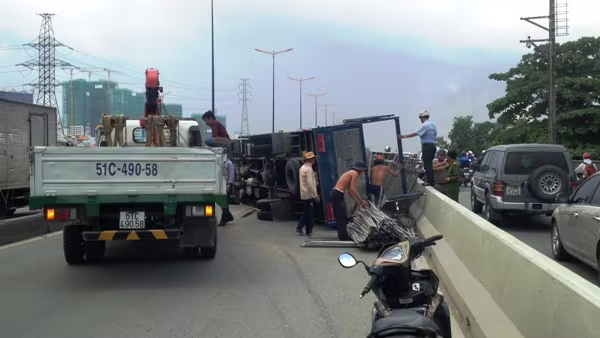 Thông tin ban đầu, khoảng 10h sáng 21/7, chiếc xe tải chở theo giàn giáo mang BKS: 51C – 918.15 do tài xế Nguyễn Hữu Nhân (SN 1990, ngụ tỉnh Vĩnh Long) điều khiển, chạy trên xa lộ Hà Nội hướng từ quận 2 đi quận Bình Thạnh. Khi chuẩn bị leo dốc cầu Sài Gòn thuộc phường Thảo Điền, quận 2 thì bất ngờ va vào giải phân cách ngăn giữa làn xe máy và ô tô, lật nhào xuống đường.