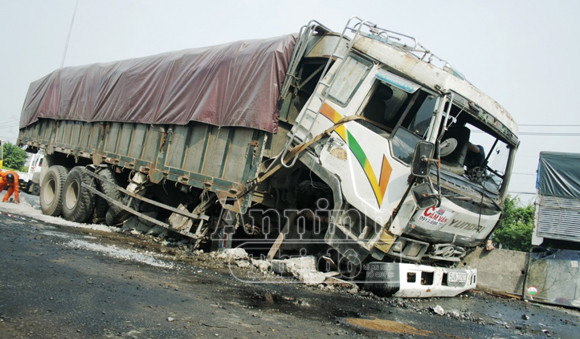 Tại hiện trường, gần 20 mét dải phân cách bị húc văng, nhiều khối bê tông bị hư hỏng. Đầu xe tải bị biến dạng, bánh và trục xe trước văng rời khỏi thân xe, nhiều dầu nhớt tràn xuống đường gây trơn trượt. Giao thông trên quốc lộ 1A bị ùn tắc nghiêm trọng, dòng phương tiện nối đuôi nhau gần 3 km, di chuyển rất khó khăn.