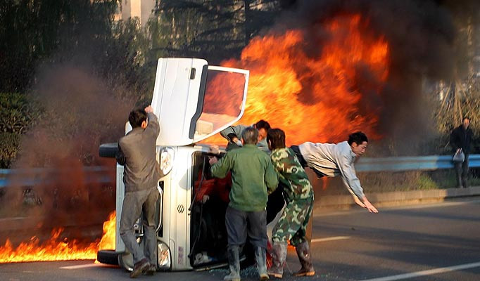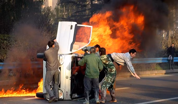 Một người đàn ông nhảy ra từ một chiếc xe tải bị lật trong một nỗ lực để giải cứu các hành khách khác. Tất cả 7 người trong xe đều cố gắng chui ra khỏi xe, vài giây trước khi chiếc xe ngập trong biển lửa.